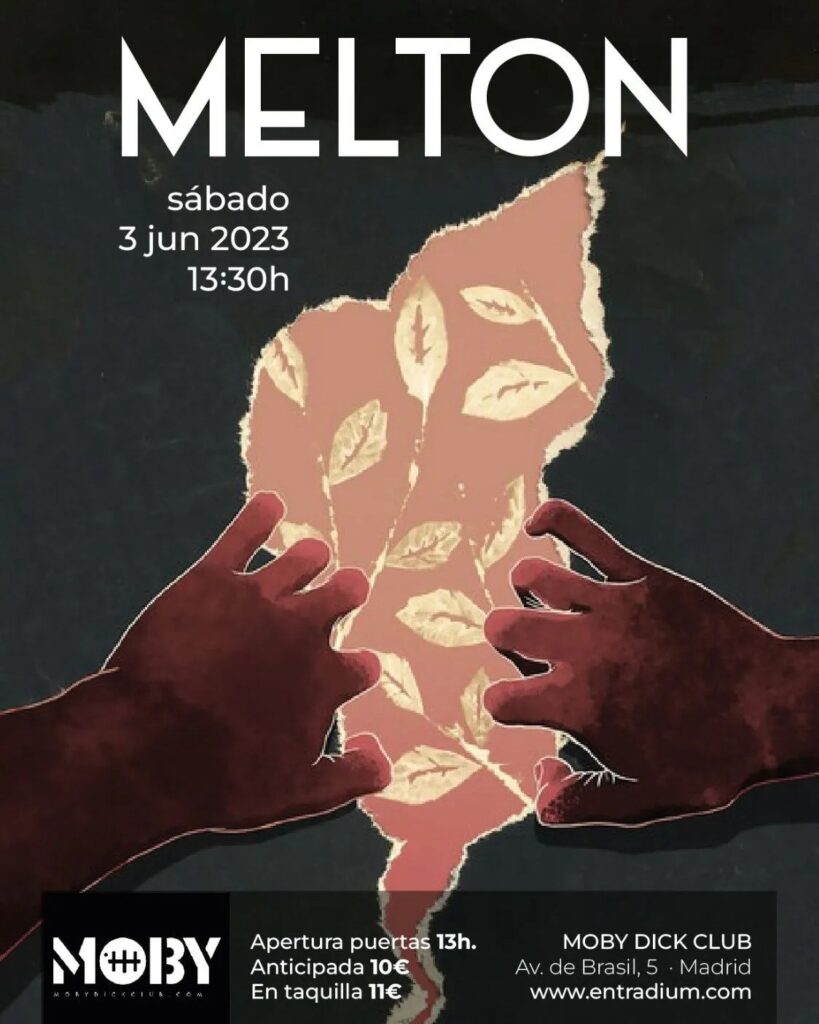 El próximo 3 de junio la banda Melton estará actuando en la Sala Moby Dick Club de Madrid, en horario vermut, a las 13:30. Sus tres últimos temas: El elemento, Volvamos a empezar y La realidad, marcan una evolución en su música y mensaje, y ante todo muestran su versatilidad en estilos, pero con su esencia en la composición de las letras.
