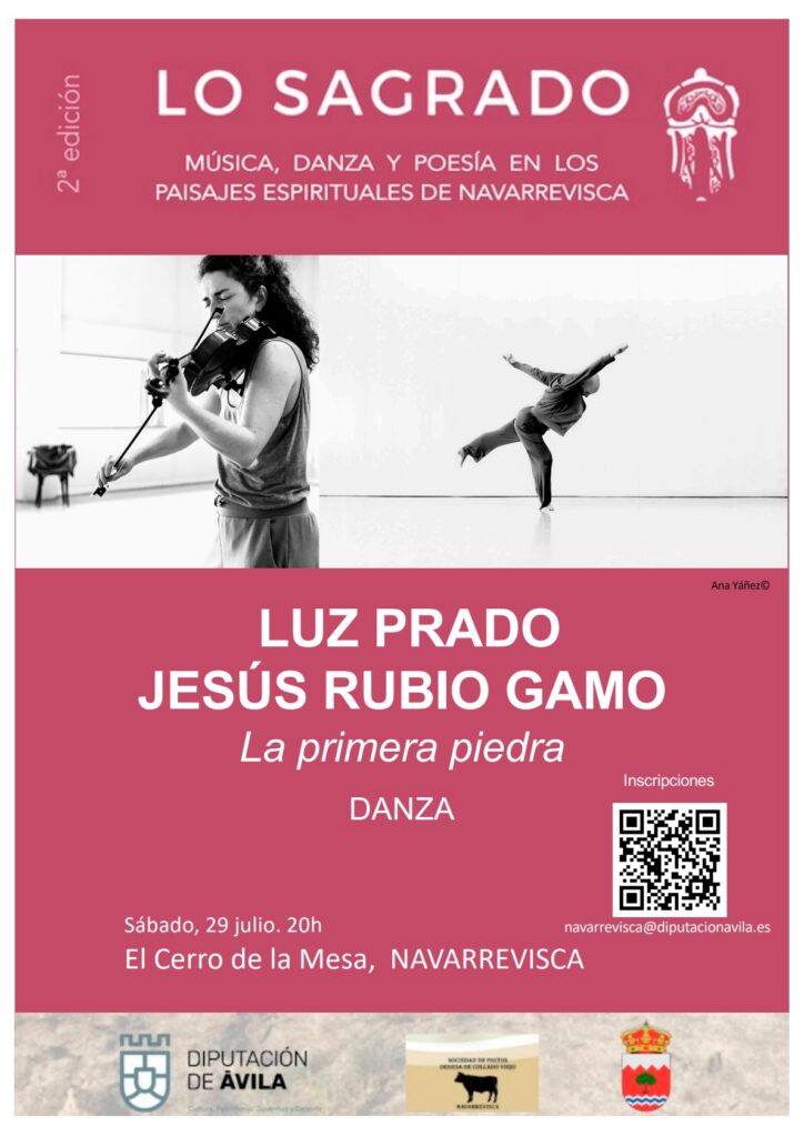La violinista Luz Prado y el bailarín Jesús Rubio Gamo combinan música y danza, dándose mutuamente espacio para encontrar el equilibrio mutuo a la hora de la expresión de su trabajo, La primera piedra. Aquí, en el Festival Lo Sagrado, ofrecerán una propuesta que se centra en la transformación del cuerpo en sonido, del sonido en movimiento y del mismo en su propio lenguaje. El Cerro de la Mesa, dará espacio tanto a ellos como al público asistente para unir su peña sagrada con la armonía de la danza y musicalidad de Jesús Rubio Gamo y Luz Prado.