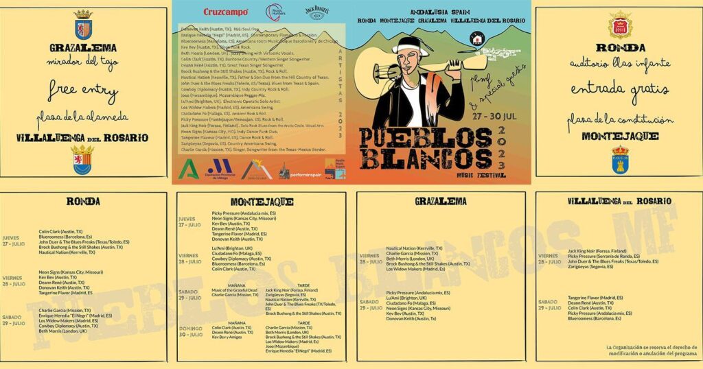 Nos cuenta que otra parte que elaboran es cuadrar el estilo de cada banda, ya que unos tocan más blues, rock, country o tex mex, o jazz y este año hemos metido algo de flamenco. El hecho de tener este año flamenco no es por la zona en sí, más bien porque el festival nunca ha estado sujeto a un estilo, ha sido siempre el espejo de lo que está pasando en Austin traerlo aquí a España y allí hay mucha variedad desde el World Music hasta el jazz, es acercar su música a Europa, desde bandas con mucha repercusión a otras mucho más independientes, grupos que giran por Texas y por todo Estados Unidos y vienen por primera vez a España y estamos bendecidos y no van a Madrid y a Europa, sino que actúan en nuestro festival, Pueblos Blancos. Y hemos metido el flamenco para que todo el que venga de fuera pueda hablar del flamenco en Texas. Enrique Heredia «Negri» se va a venir a pasar allí unos días con el resto de bandas. Uno de los objetivos de este festival siempre ha sido el poder crear una relación entre bandas locales y de Estados Unidos.