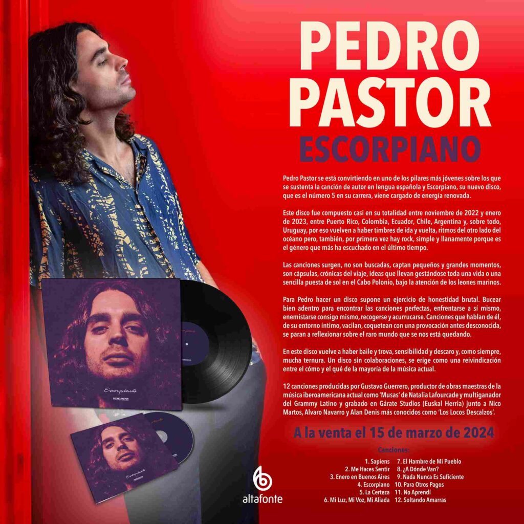 Escorpiano tiene doce canciones que navegan por distintos ritmos y melodías, con letras que evocan un viaje, donde Pedro Pastor ha plasmado lo que sentía en esa gira, en esos momentos, y como ayer mismo también contaba en algunos momentos de reflexión, o composiciones sacadas de alguna anécdota. Los sonidos diferentes a sus discos anteriores poseen unos ritmos más rock, pero no ha dejado de lado esa parte más latina que impronta a sus trabajos, y tampoco se ha olvidado de la rumba, aunque reconoce que ese toque ha sido dotado por parte del productor. Nos cuenta que en las letras, en parte, hay una saudade, palabro que aquí no tenemos, pero allí sí, nostalgia del que extraña su casa cuando está fuera.