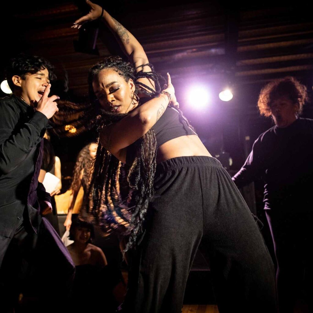 Precisamente el montaje, el encontrar la forma que contenga todos los lenguajes que se escribían de manera simultánea en escena. El material tanto textual como coreográfico iba buscando su propia forma de coexistir con el resto de materiales y eso implicó tener momentos de extravío y darnos el chance de navegar en esas pérdidas y con esas incertidumbres en escena.
