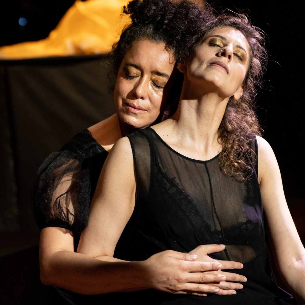 Eurípides describe una imagen final que parece haberse invisibilizado frente al crimen que Medea se atrevió a cometer: subida sobre dos dragones, se eleva y huye hacia el Sol que la protege. Sobre esa imagen construimos también estas Medeas, una que vuela impulsada por las voces de las mujeres que la nombran y la invocan, un coro femenino que la acompaña y es la memoria de las maternidades en la que cada crimen se resguarda, cada luto y cada amor se contiene, cada meditación se protege y se cuida.