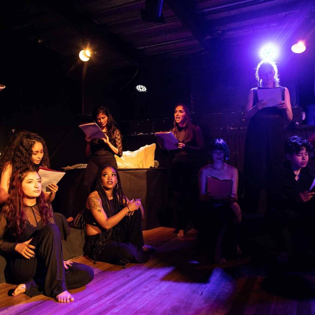 Después de la pandemia el colectivo se planteó volver a hacer una obra de gran formato, desde el primer momento nos la imaginamos grande, con muchos cuerpos en escena, como una necesidad de volver a encontrarnos, a apostarle al teatro. Entonces discutimos mucho sobre posibles proyectos y nos llamó la atención trabajar sobre un clásico. Habíamos, hace algunos años, hecho una reescritura colectiva de Antígona y esta vez pensando en que la temática de la maternidad nos estaba interpelando a algunas de nosotras, decidimos trabajar en Medea.