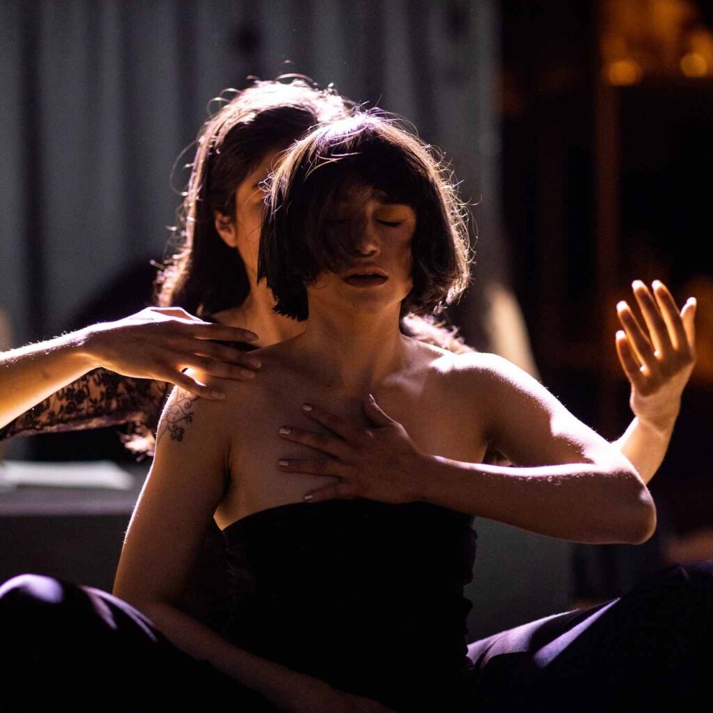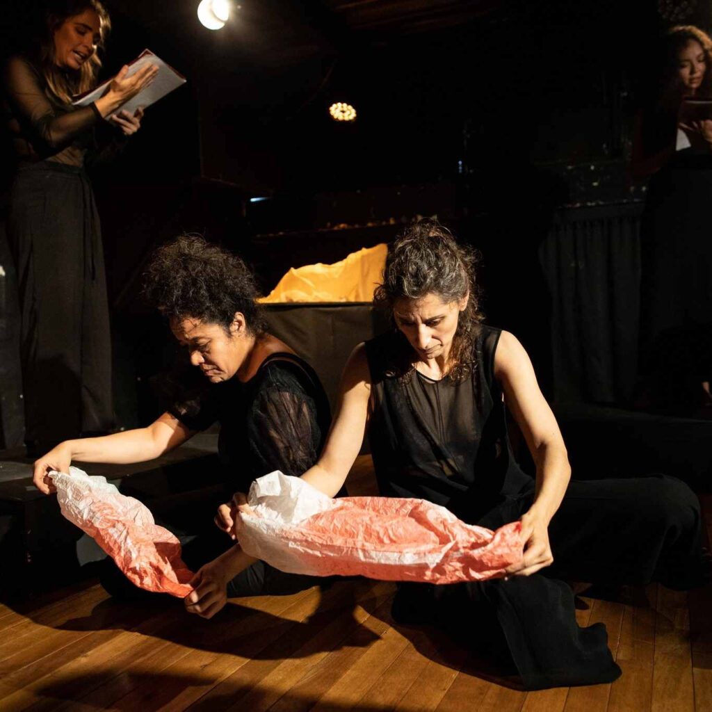 Partimos por trabajar con una cartografía visual y conceptual que fue el resultado de nuestra primera etapa de investigación. A partir de allí comenzaron las actrices y bailarinas a proponer imágenes, secuencias, partituras. A su vez, arrancó la escritura de texto, que en primera instancia estaba constituido solo por las didascalias y que luego se alimentó con lo que sucedía con los cuerpos y las imágenes en escena. En este sentido, se puede decir que fue una escritura a pie de escena. Al mismo tiempo, las actrices investigaban con los objetos y las atmósferas que proponían los artistas visuales y de iluminación y con los músicos. Fueron seis meses de crear en una residencia con todos los artistas trabajando de manera simultánea para producir escenas, textos, fragmentos que fueron tejiéndose desde la dirección.