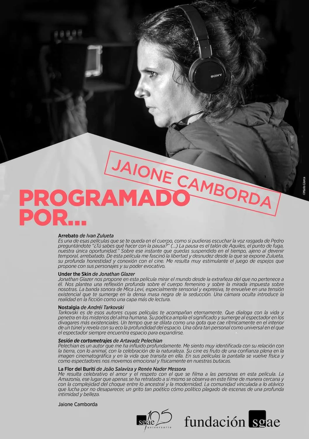 Arrebato, además de su autenticidad y su lenguaje libre, me impresionó en su momento mucho el trabajo que tiene de personajes espejos, y con el tiempo me han inspirado, porque es algo en lo que exploro en mis películas. Tarkovski también tenía que estar por su influencia, y elegir Nostalgia fue porque trata temas que me interpelan personalmente, y trata la figura de la mujer, de la maternidad. El traer Under the Skin, que sí, efectivamente puede ser lo más distante de mis trabajos, me pareció interesante traer algo con un tono más actual, y ver cómo se mezclan lenguajes cinematográficos, mezclando casi el documental con la ciencia ficción. Es sutil y profundo y me pareció bueno charlar sobre ello. La flor de Buriti ha sido entre casualidad y que no sabía en su día cuando la vi que se iba a estrenar en España (5 de diciembre); tengo mucho vínculo con la Amazonía por cuestiones personales, y me gusta el amor y el respecto con el que ruedan y se nota en la pantalla, que incluso a veces eso es más importante que el propio mensaje, como ruedas lo que tienes delante y como transmites el amor hacia lo que estás filmando.