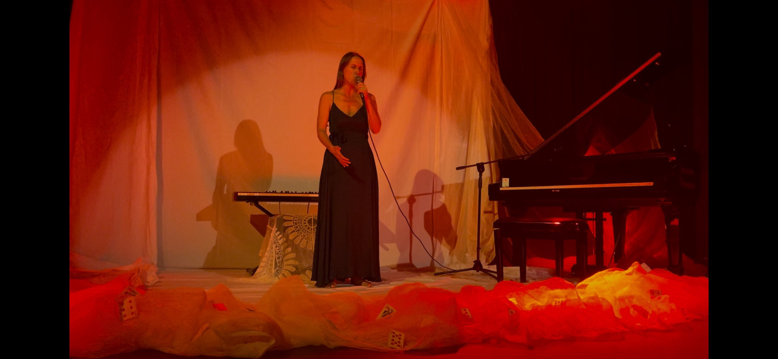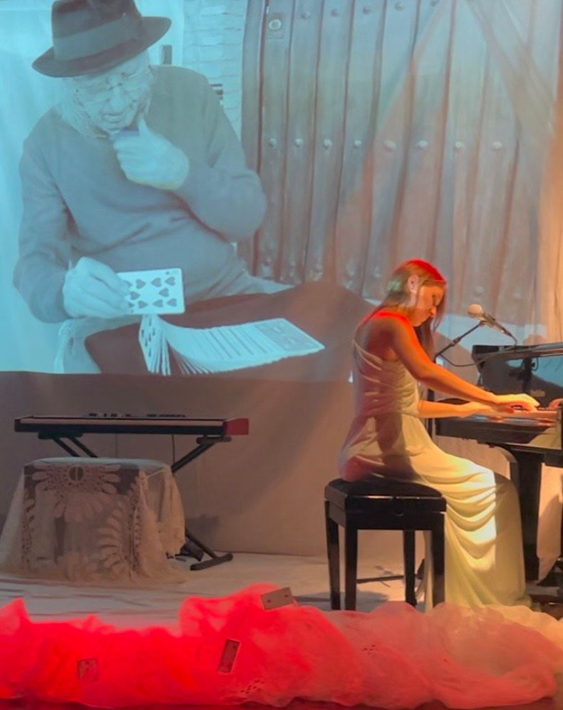 La puesta en escena del concierto – espectáculo de Alicia Tamariz no solo es un homenaje a su familia, sino que, sobre todo, es un diálogo con Juan Tamariz, su padre, que está presente en proyecciones entablando un diálogo con Alicia y con el público como si fuera un protagonista y artista más presente en el escenario.