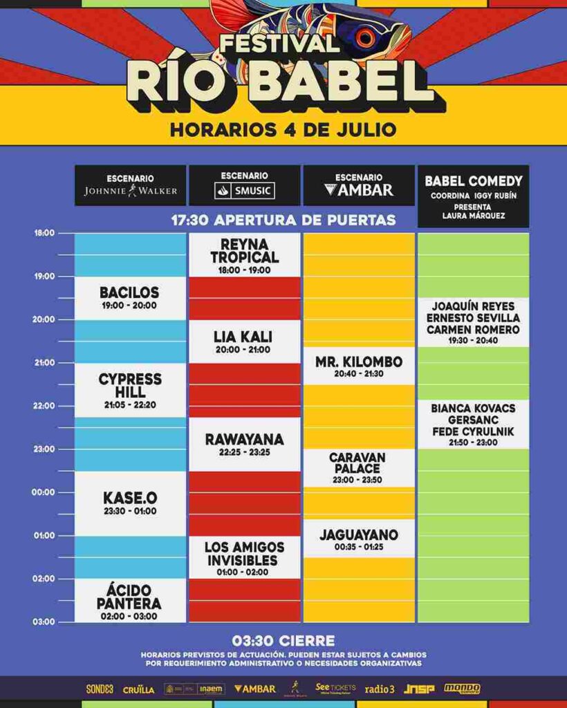 El viernes 4 de julio el festival tendrá a Cypress Hill, banda legendaria de hip hop, que se formó en 1986 y ha vendido más de 46 millones de álbumes en todo el mundo, y no sólo les avalan estas cifras, continuidad y ventas, también su directo, potente y que hará que el público disfrute con el ambiente que crean. Desde Francia llega Caravan Palace, que trae su electro swing; diecisiete años de andadura musical, tras su primer LP, hacen de ellos una propuesta solvente. Pop latino, con Bacilos desde Estados Unidos, que se nutre de componentes de Brasil, Colombia y Puerto Rico. Desde Venezuela, Rawayana traerá el reggae y pop psicodélico, y Los Amigos Invisibles el acid jazz y el funk. La electrónica más tropical desde Colombia con Ácido Pantera, pero que también nos llevará por la cumbia y ritmos latinos. Para seguir con ritmos tropicales y sonidos electrónicos estará Jagüayano. Reyna Tropical, que tiene una original mezcla de ritmos afrocaribeños, latinos y música electrónica. Dentro del panorama musical, el festival apuesta por el referente del rap en español, como es Kase.O, la versatilidad de Mr. Kilombo, que harán que el baile no acabe, y una de las grandes voces que serán cartel en muchos festivales en breve, Lia Kai.