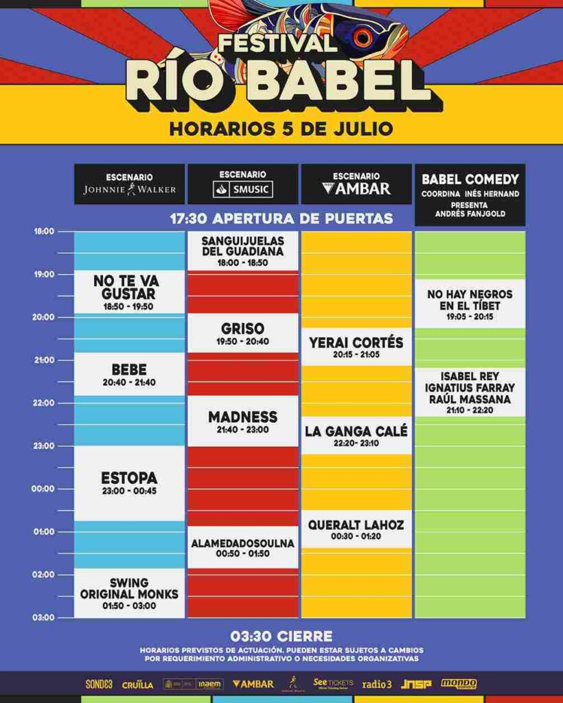 El sábado 5, Rio Babel sobre todo tendrá sonido español con Estopa, que pasan ya de los veinticinco años en el escenario, y que son de los grupos con más aceptación de nuestro panorama musical. Sus letras son pegadizas e invitan a corear y bailar. Bebe, Yerai Cortés, Queralt Lahoz, Alamedadosoulna, La Ganga Calé, Sanguijuelas del Guadiana y GRISO darán otra tonalidad a la jornada, desde la parte más compositiva de Griso en su nueva faceta a la más bailable de La Ganga Calé, que son un torbellino en directo; el rock de los extremeños Sanguijuelas del Guadiana, Queralt Lahoz con sus tintes flamencos, Alamedadosoulna con el mejor ska-reggae-soul. Bebe con su potencia y su carisma, y la gran revelación del mestizaje actual con Yerai Cortés. Con treinta años de carrera y rock en español desde Uruguay estará No te va a gustar. Desde Ecuador y con su world music, estarán Swing Original Monks. Madness, grupo británico y referente del ska, no dejará de sonar con sus clásicos atemporales, ya que la banda data de 1976.