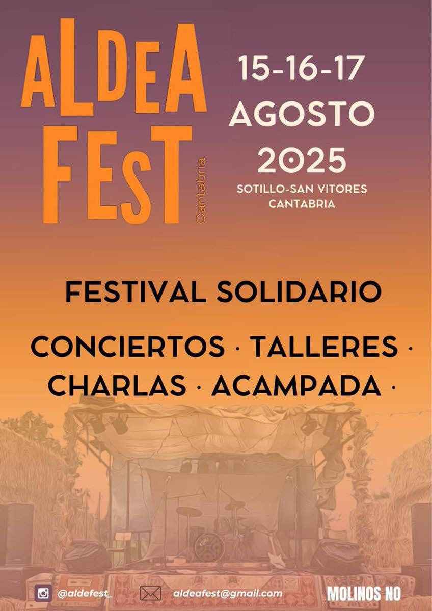 Aldea Fest tendrá su cuarta edición los días 15, 16 y 17 de agosto en Sotillo y San Vitores (Valdeprado del Río, Cantabria). Es un festival solidario, autogestionado y de formato reducido, que aúna música, actividades comunitarias y debates públicos. Es un evento sin ánimo de lucro y donde todos los fondos recaudados se destinarán a apoyar la defensa del territorio frente a la implantación de macroparques eólicos (Henestrosas, Morosos, Ornedo, Olea, Cotío y Somalomas-Las Quemadas).