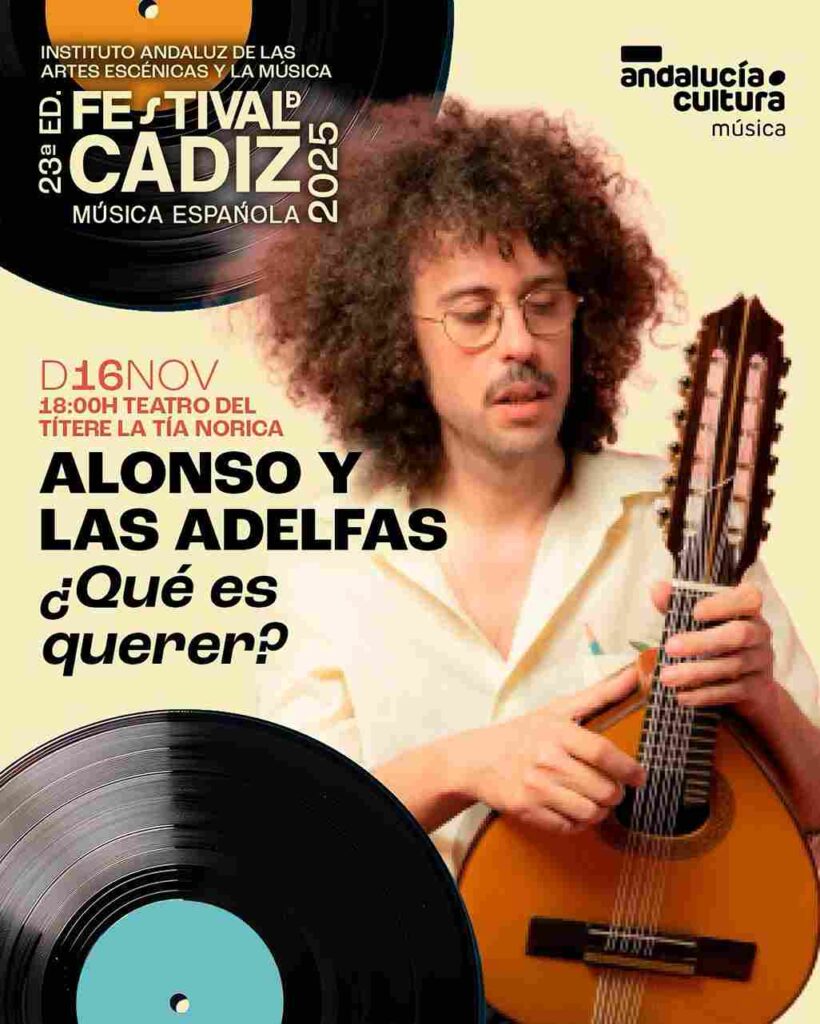 Dentro de la programación del Teatro del Títere Tía Norica del Festival de Cádiz – Música Española estará Alonso y las Adelfas, el día 16 de noviembre. Alonso Díaz Carmona ha comenzado su carrera en solitario, con el disco ¿Qué es querer? Como banda ha tenido a Napoleón Solo, y nos cuenta que en estos momentos está en reposo, lo que no quiere decir que no vuelvan en cualquier momento, y también tiene colaboraciones y producciones con Solea Morente, Dellafuente, Lorena Álvarez —quien también está dentro del certamen— o Los Planetas.